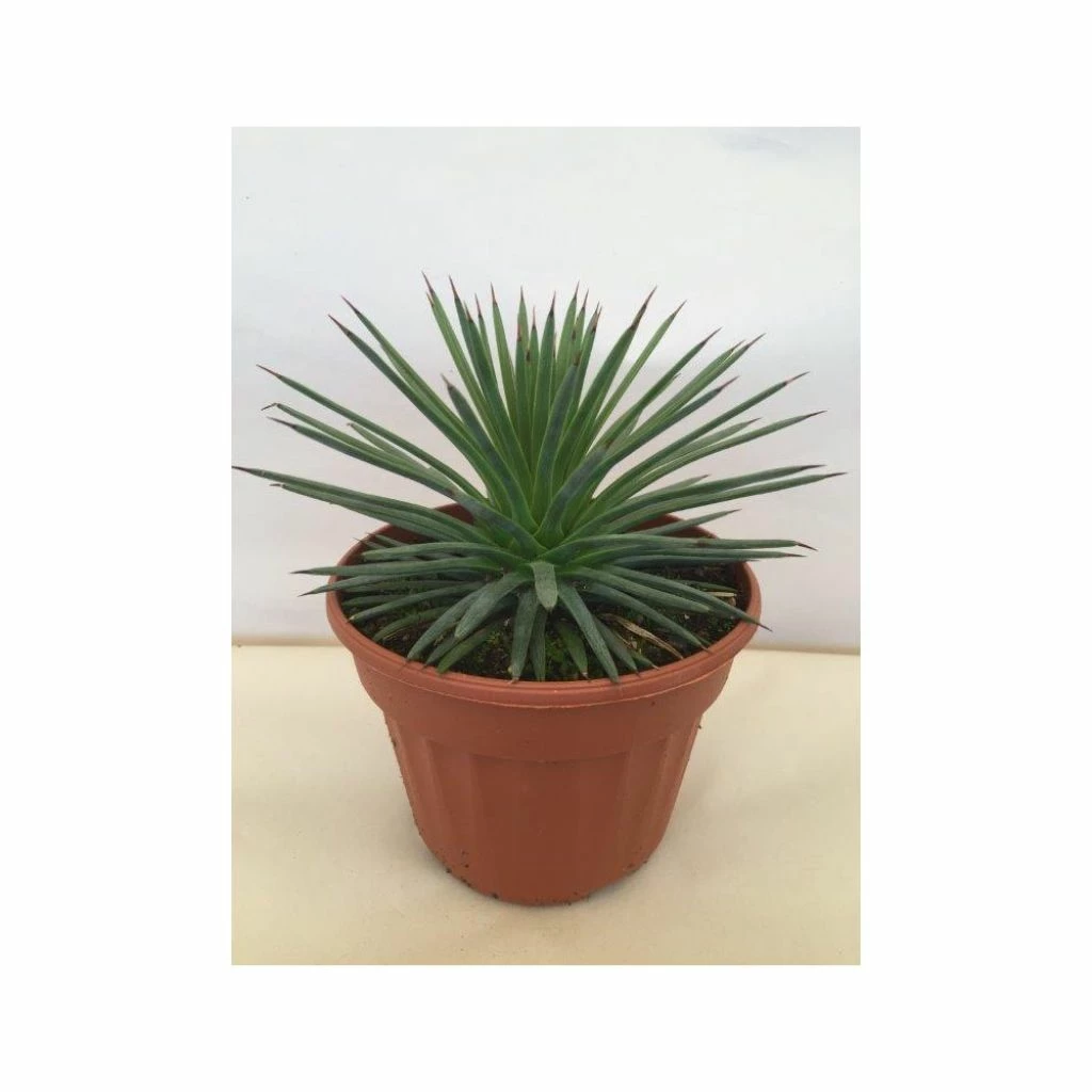 L’Agave stricta ‘Nana’ est la forme naine, bleutée de l’Agave stricta, atteignant seulement 30 cm en tous sens à maturité ! Cette vivace succulente se présente sous forme de touffe compacte, symétrique aux très nombreuses feuilles fines, glauques, arquées vers le haut qui lui donnent l’apparence d’un hérisson. Elles se munissent d’épines terminales rouge bordeaux qui contrastent joliment avec la teinte bleutée de la plante. En grandissant, elle s’étendra lentement en largeur en émettant quelques drageons à son pied pour former des petites colonies hérissées. Cette espèce aime particulièrement les terrains secs et résiste bien aux températures négatives allant jusqu’à -12ºC en sol dépourvu d’humidité. Son petit développement permet de décorer une petite rocaille ou un pot sur une terrasse.