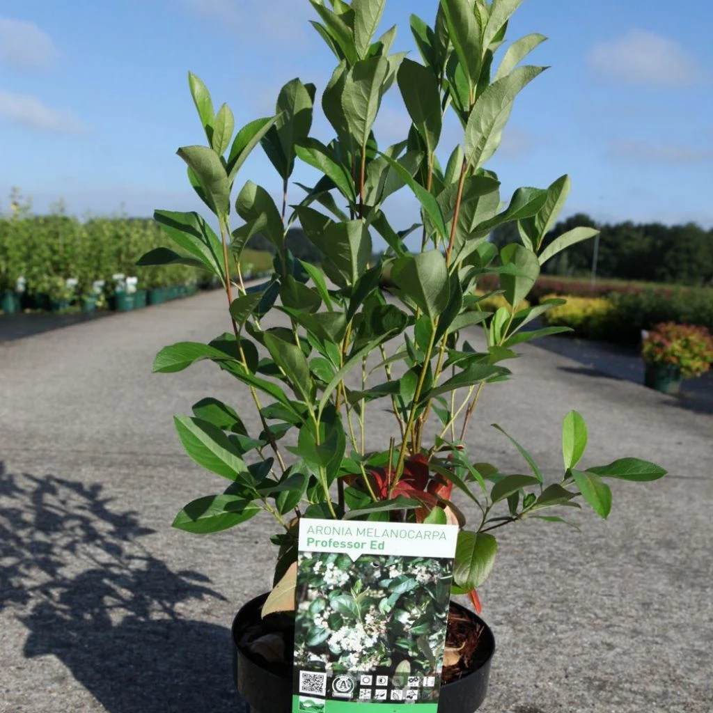 L’Aronia melanocarpa ‘Professor Ed’ appelé autrement aronie à fruits noirs, est une variété compacte convenant mieux aux jardins de petite superficie. C’est un arbuste polyvalent, donnant de jolis corymbes de petites fleurs mellifères, parfumées, blanc pur en mai-juin suivies de baies abondantes de 1 cm de diamètre d’un violet virant au noir brillant à maturité et au goût léger de cassis, très nutritives, astringentes, comestibles sous forme de confitures, gelées ou tartes. Suspendues aux pétioles fins et rouges, elles attirent aussi les oiseaux qui en raffolent. Son feuillage ovale, vert lustré prend des belles teintes rouge orangé en automne avant de tomber au sol. Originaire des zones humides du nord-est des États-Unis, il préfère les sols drainés, fertiles, neutres à acides, frais, au soleil ou à mi-ombre. C’est un arbuste simple à cultiver qui mérite une place en haie libre ou en haie fruitière.