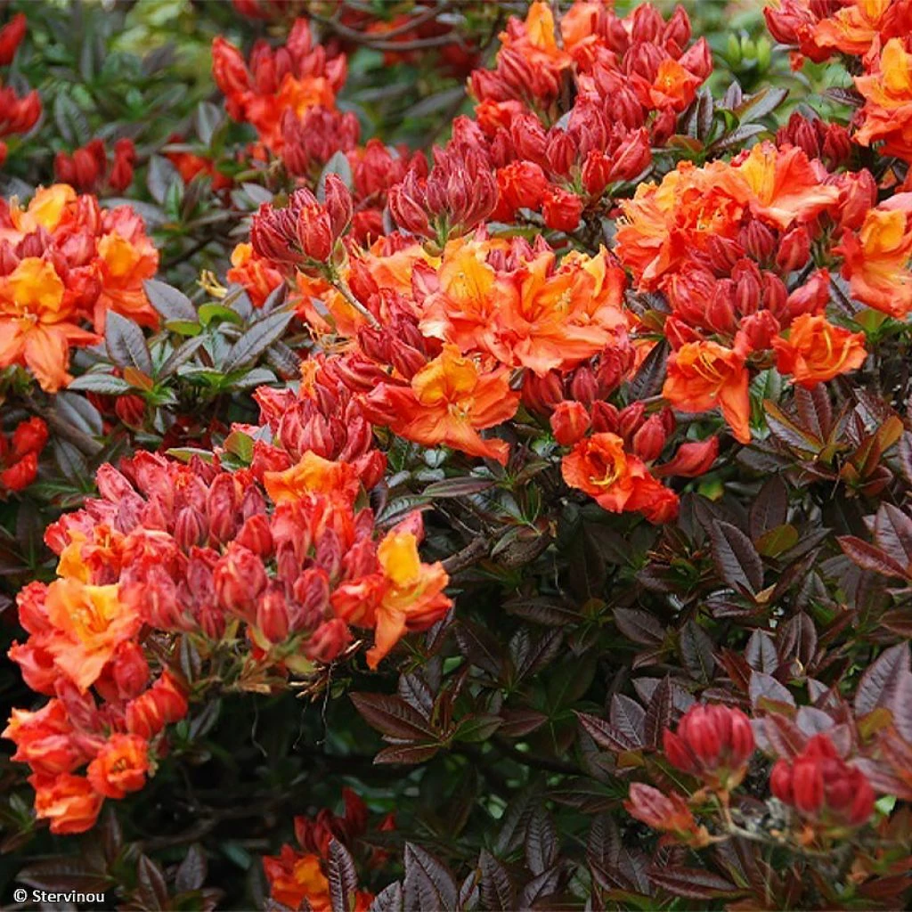 L’Azalea Mary Poppins (Knap Hill – Exbury) est une variété d’azalée de Chine flamboyante, aussi décorative par sa floraison rouge orangé que par les couleurs printanières et automnales de son feuillage. Au printemps, ses fleurs éclosent en bouquets sur une plante joliment arrondie vêtue de toutes jeunes feuilles teintées de bronze cuivré. On retrouve des tonalités flamboyantes sur le feuillage en fin de saison. Contrairement aux azalées du Japon, cette plante est caduque et parfaitement rustique. Trop peu connues et utilisées, les azalées de Chine sont des plantes de sol non calcaire très gracieuses, dotées de nombreuses qualités, à découvrir sans hésiter au jardin ou dans un grand pot sur la terrasse !