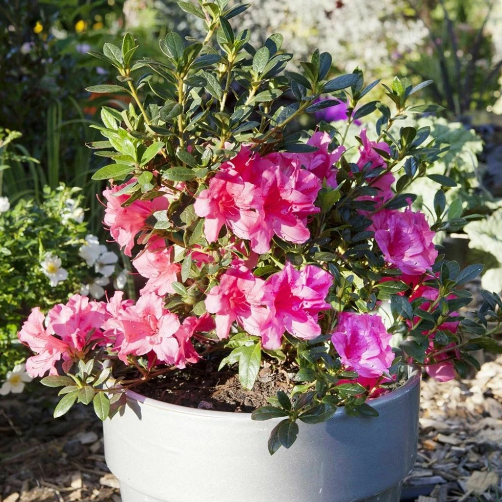 L’Azalée hybride Encore® ‘Carnival’ est une variété vigoureuse, dont les fleurs simples flammées de deux tons de rose framboise enchantent le jardin pendant des mois. Elle appartient à  la série Encore® qui fait de l’azalée du Japon, à présent dotée de floraisons successives et spectaculaires, une plante presque aussi décorative que le rosier. Ce joli buisson persistant fleurit deux à trois fois par an selon le climat : d’abord en abondance en fin d’hiver ou au début du printemps, puis au cours de l’été avant une belle remontée en fin d’été ou en début d’automne.  A l’aise au soleil ou à mi-ombre, relativement rustiques, les azalées hybrides de la série Encore® conviennent à toutes les utilisation et il en existe pour tous les goûts, à fleurs simples ou doubles, plus ou moins compactes, dans une gamme de coloris variés incluant le blanc, le rouge, différents tons de rose, le saumoné, et l’orange-vermillon. Mariez-les entre elles pour créer selon vos envies des massifs champêtres ou des décors plus sophistiqués. Comme toutes les azalées, ‘Carnival’ aime les sols non calcaires, frais mais drainants, assez fertiles pour soutenir ses floraisons successives.Â