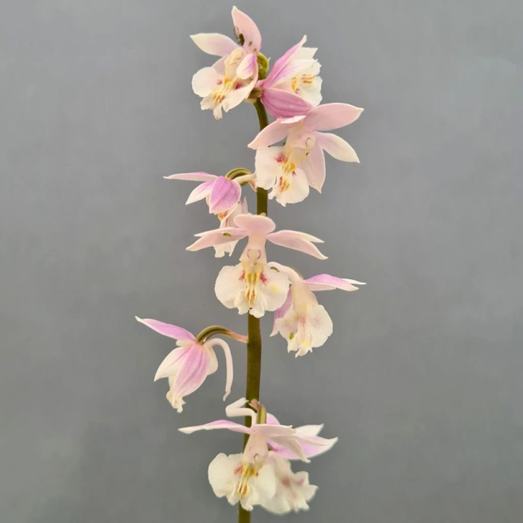 Le Calanthe Pink & Cream est un hybride horticole. Le genre Calanthe, de la famille des Orchidacées, compte 150 espèces originaires des zones tropicales et sont essentiellement concentrées en Asie. La floraison de ces calanthes est longue, certaines espèces et cultivars sont dotés d’un parfum très agréable. Il existe 2 groupes de calanthes, les unes ont un feuillage persistant en hiver et les autres un feuillage caduc. La végétation de cette variété Pink & Cream, caduque, émerge du sol au printemps et sèche en automne. La plante forme une touffe de feuillage d’environ 30 cm en tous sens. Cette orchidée développe un pseudo-bulbe, d’où sortent en début de printemps de grandes feuilles vert clair, mesurant de 15 à 40 cm de long et de 8 à 15 cm de large. Elles sont de forme largement ovale, parcourues de nervures parallèles fortement imprimées. Au printemps, entre fin avril et fin mai, la plante émet de belles hampes florales de 45 cm de haut, portant plusieurs fleurs globalement bicolores. Elles sont largement ouvertes, composées de sépales et pétales allongés, un peu pointus, plus ou moins colorés de rose, et d’un labelle trilobé assez large dans des tons crème. La souche est faiblement drageonnante. La plante entre en repos l’hiver, lorsque son feuillage a complètement jauni.Â