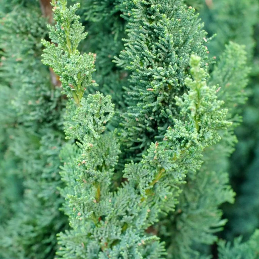 Les Chamaecyparis font partie de ces conifères à feuillage dense écailleux appréciés pour l’élaboration des haies notamment avec l’espèce Chamaecyparis lawsoniana, utilisée étonnamment dans sa forme type. Elle fait cependant partie des conifères ayant engendré le plus grand nombre de cultivars (plus de 200 !) comme Alumii au feuillage compact très bleuté et à la forme conique de 3 à 4,50 m ou Ellwoodii, très utilisé en haie. La forme sauvage capable d’atteindre en culture 36 m de haut avec un tronc de 1,20 m de diamètre nous vient du nord-ouest des Etats-Unis tout comme le Thuya géant. Ses rameaux teintés de vert sombre ou vert bleuté, aux extrémités légèrement retombantes lui donnent une remarquable allure ondoyante un peu fantasmagorique tandis que sa variété Aurea Densa forme une spectaculaire colonne dorée bien compacte. Le Cyprès Sawara (Chamaecyparis pisifera) et le Cyprès du Japon Hinoki (Chamaecyparis obtusa) offrent aussi un éventail de cultivars nains ou moyennement vigoureux, aux rameaux filandreux ou au contraire obtus, aux allures de fougères (C. obtusa Teddy Bear), aciculaires chez obtusa Wissel dans de très beaux coloris doré, bleuté ou vert intense.