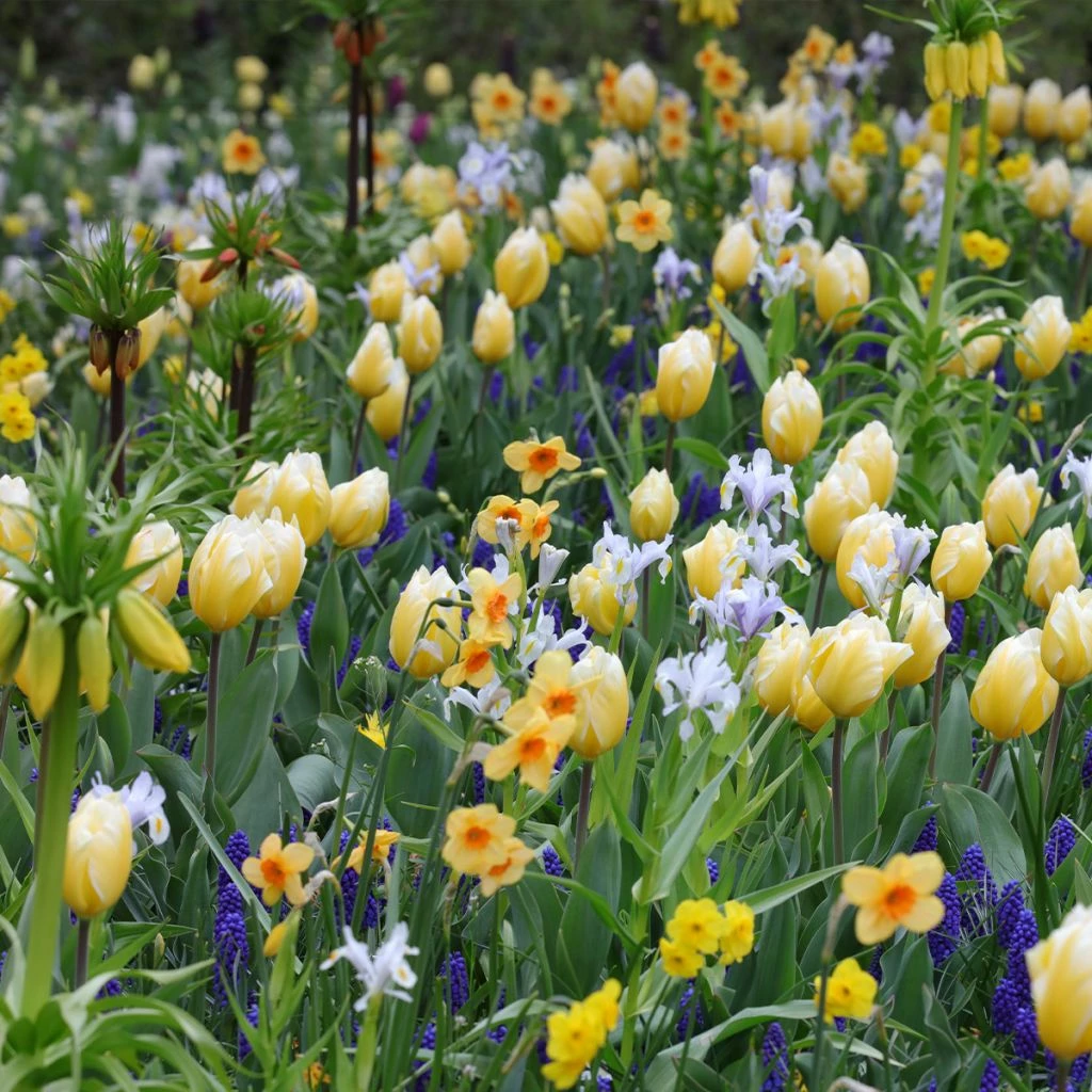 Une collection qui met en scène de façon brillante le contraste et l’harmonie en jouant avec la complémentarité des couleurs et des formes de fleurs. Sans oublier le parfum. La tulipe et le narcisses, tous deux dans des tons de jaune, percutent le bleu violacé vif des muscaris, tandis que la fleur de porcelaine de l’iris, d’un blanc lavé de mauve et rehaussée d’or, harmonise l’ensemble. Tous ces bulbes qui fleurissent de concert créent un tableau à la fois joyeux et plein de fraîcheur qui annonce en fanfare le retour du printemps. Ajoutez de la hauteur et du style à votre massif en intercalant des fritillaires impériales !Â