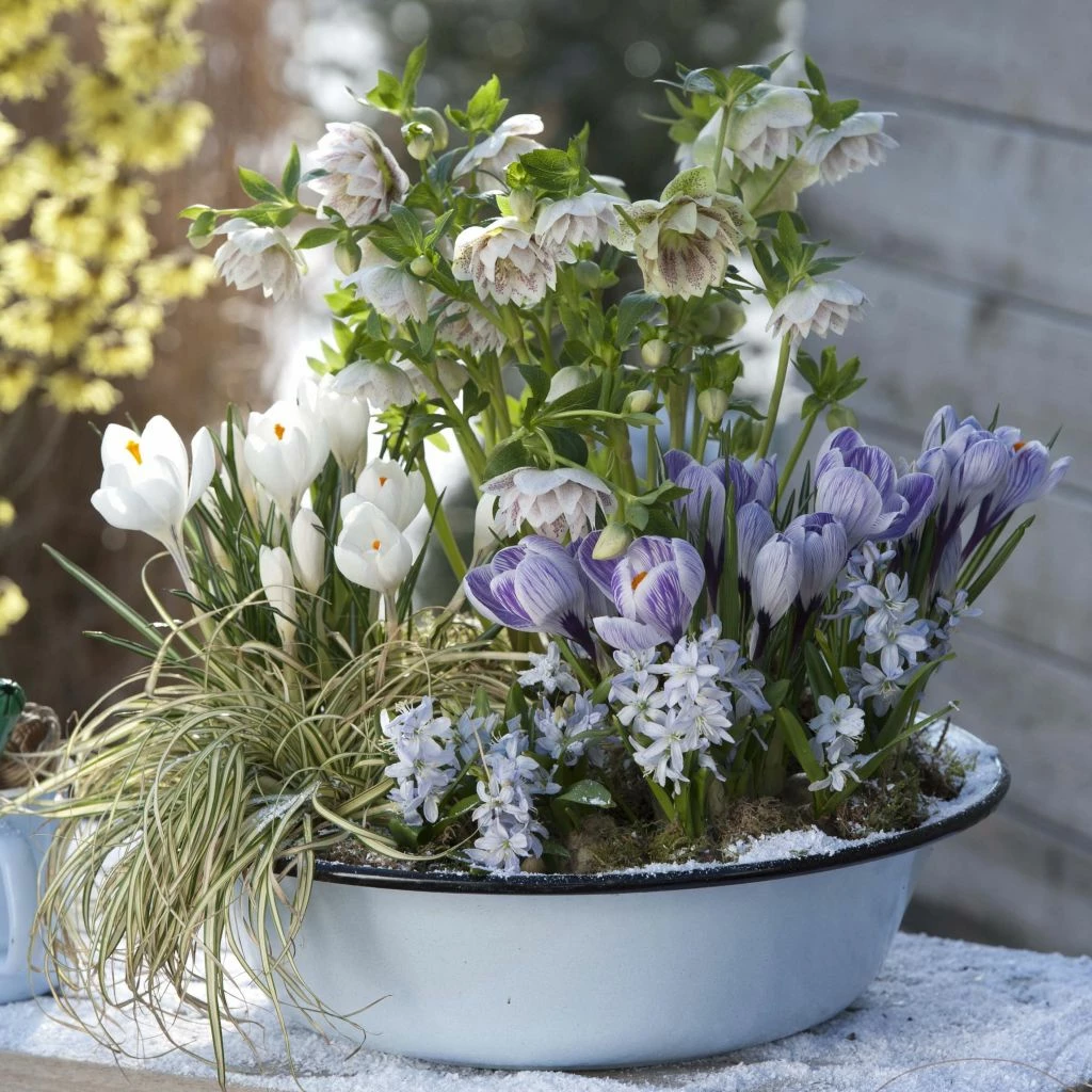 Une collection pour composer une ravissante potée ou jardinière fleurie qui égayera balcons ou terrasses du cœur de l’hiver jusqu’à l’arrivée des beaux jours. Les fleurs blanches de l’Hellébore ‘Double Blanc’ feront leur apparition dès le mois de janvier ; elles seront vite rejointes par les belles nuances bleues des crocus et du Puschkinia qui prolongeront le spectacle jusqu’à la fin du mois de mars. Le feuillage du carex et de l’hellébore restera décoratif toute l’année. Cette collection très rustique sera idéale pour éclairer une terrasse mi-ombragée, sur un balcon ou devant la porte d’entrée. On veillera à protéger ces plantes de sous-bois des rayons brûlants du soleil en été.