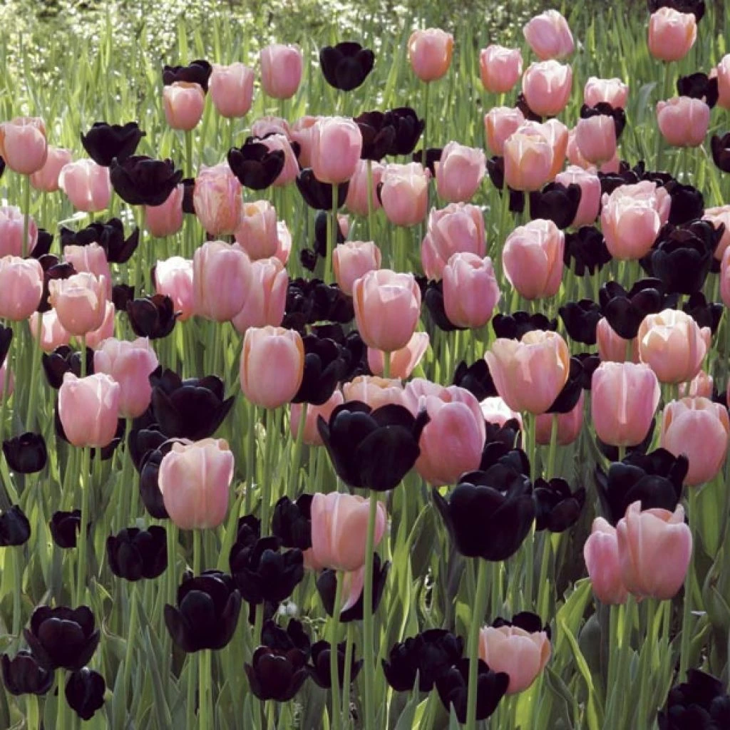 Un assortiment de 50 tulipes roses et noires aux coloris complémentaires pour une composition toute en contrastes. Deux variétés, Menton et Reine de la Nuit, emballées séparément et étiquetées.Â