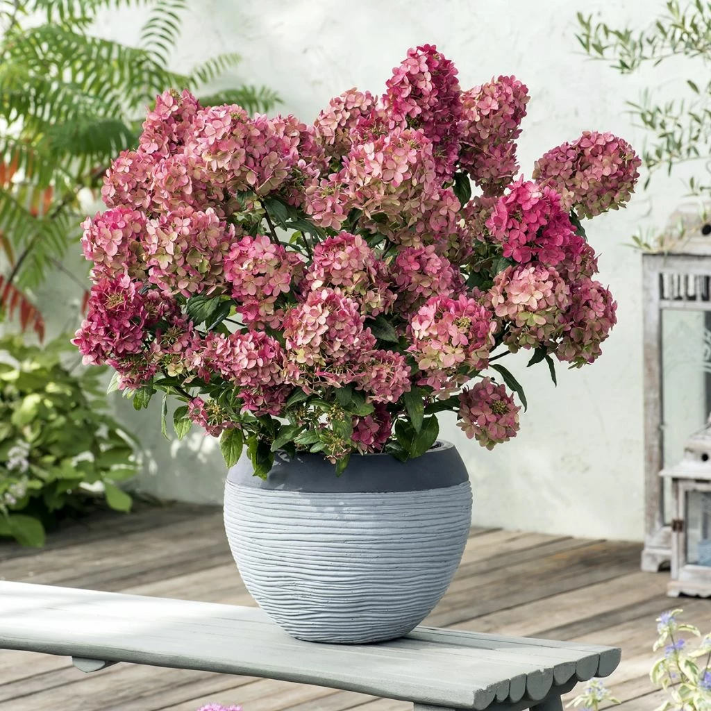 L’Hydrangea paniculata ‘Petite Star’ est une variété d’hortensia paniculé au développement compact qui se démarque par une floraison abondante qui change de couleur tout au long de l’été, très décorative pendant plus de trois mois. Ses panicules de fleurs arrondies et compactes qui passent du vert citron au rouge en passant par le blanc crème et le rose couvrent presque sa végétation basse et large. Idéal pour l’aménagement des petits jardins, cet hortensia fait également beaucoup d’effet dans un pot sur la terrasse.
