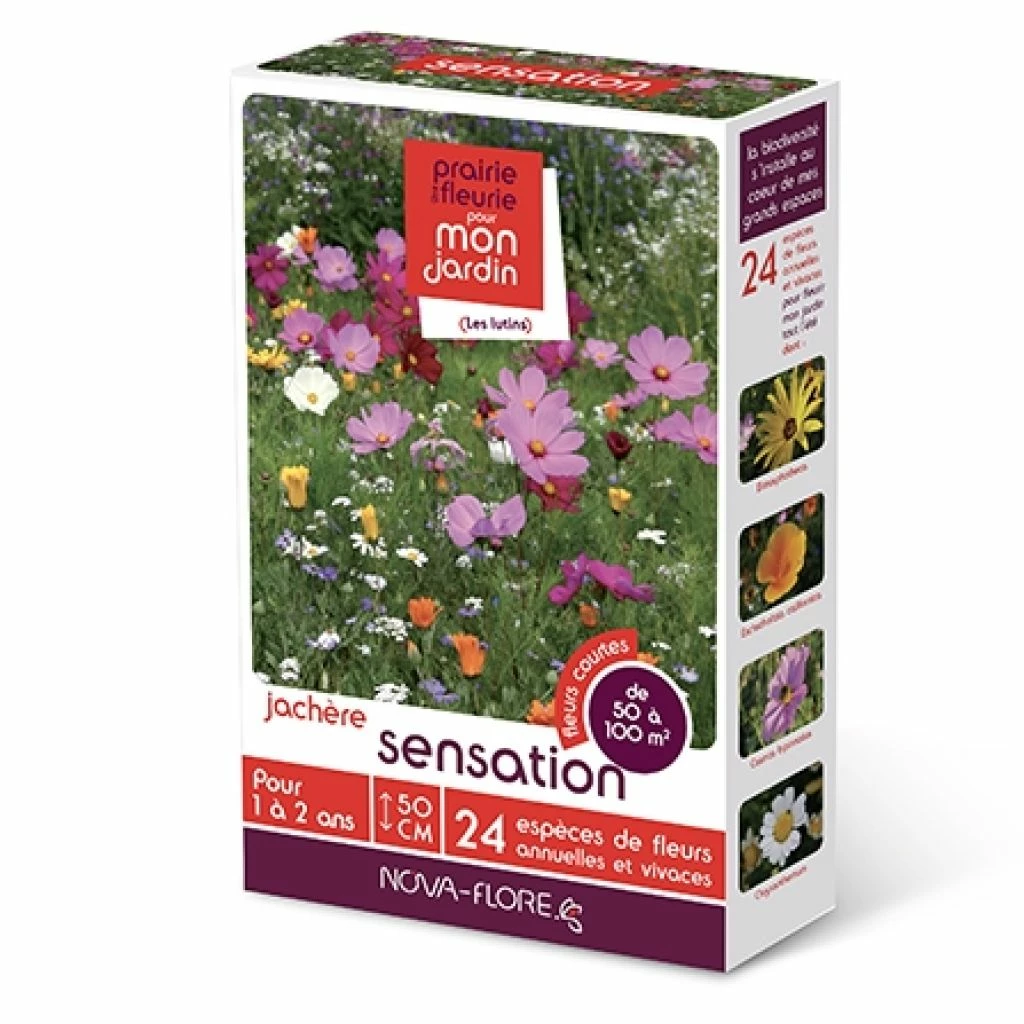 La jachère fleurie est très tendance, et elle allie l’utile à l’agréable :  fleurissant durant toute la belle saison, elle possède un charme bucolique, favorise la biodiversité et s’avère économe en eau. Un arrosage occasionnel en période très sèche suffira pour obtenir de nombreuses fleurs. Idéal pour apporter une touche colorée et champêtre au jardin, cette jachère Sensation offre des fleurs souvent nectarifères ou mellifères, apportant une source de nourriture non négligeable pour les insectes butineurs. Invitez la nature dans votre jardin: semez nos mélanges de fleurs dans une zone un peu délaissée du jardin, près du verger ou du potager, sur un grand talus ou encore dans le fond du jardin à la frontière avec la campagne.
