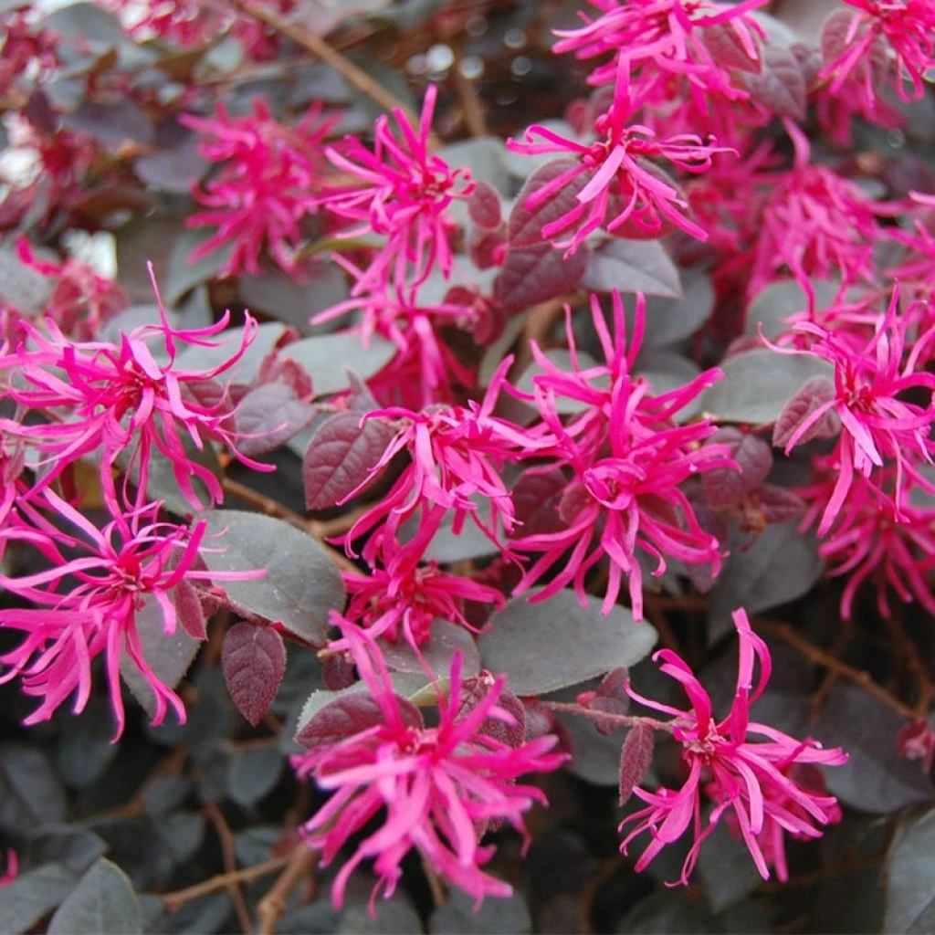 Les Loropetalum sont très tendance ; intéressants en toutes saisons, bien adaptés à la culture en pots, peu encombrants, ils séduisent les jardiniers urbains mais aussi les amateurs de jardins à l’anglaise. Ils se démarquent dans les scènes printanières, joliment colorés alors que le jardin est encore bien peu fleuri. Les fleurs mellifères sont aussi une bonne source de nectar pour les abeilles en début de saison. Si l’arbuste est relativement rustique une fois bien installé, les jeunes plants peuvent souffrir dès -6 ou -7 °C, il faudra les protéger des fortes gelées dans le nord de la France. Vous pouvez le cultiver en pots en région froide, dans un terreau non calcaire, mais fertile, à remiser en hiver. Cette variété Plum Gorgeous® s’avère économe en eau une fois bien établie. C’est une magnifique sélection pour l’ornement des petits espaces, des talus, des rocailles et des terrasses. Associez-le par exemple au plumbago rampant (Ceratostigma plumbaginoides), Berberis Atropurpurea Nana, aux myosotis, armoises arbustives ou encore aux santolines.