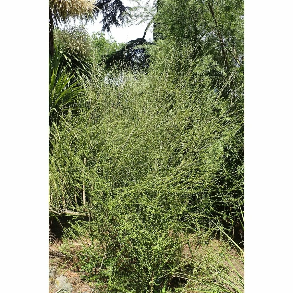 L’Olearia virgata n’est certes pas le plus spectaculaire du genre, mais la finesse de sa ramure et de son feuillage, tissant en peu d’années une masse dense et dressée de couleur vert-gris, lui confèrent cet aspect singulier, à la fois austère, élégant et indomptable, qui n’appartient qu’aux plantes de littoral. Sa floraison estivale en petites pâquerettes d’un blanc-crème un peu sale est discrète, mais agréablement parfumée, et souvent entourée d’un cortège d’abeilles trop affairées à butiner pour s’occuper du jardinier. Il s’agit là de l’un des meilleurs arbustes persistants, avec son cousin l’Olearia traversii, pour constituer des écrans efficaces en bord de mer. Cet hybride est aussi l’une des plus rustiques, des plus vigoureuses et des plus tolérantes.Â