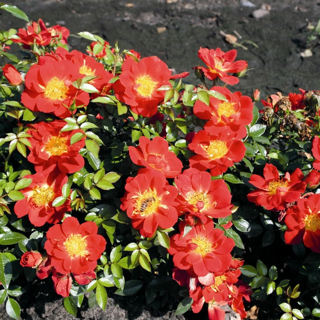 Les fleurs du Rosier ‘Bee’s Paradise Light Red’, réunies en petits bouquets terminaux, lui viennent du rosier polyantha, un ancien hybride issu du Rosa multiflora et du R. chinensis. Elles sont particulièrement riches en nectar et en pollen. Bien ramifié, il forme un buisson très touffu d’environ 50 cm de hauteur pour 60 cm de largeur. Les fleurs en coupes semi-doubles, de 2 à 4 cm de diamètre, sont composées de 5 à 10 pétales rouges. Elles s’épanouissent en dévoilant leur cÅ“ur rempli d’étamines jaune d’or. La floraison commence en juin et se renouvelle par vagues successives jusqu’en octobre. Chez les rosiers Bee’s Paradise, les fleurs fanées tombent toutes seules, sans qu’il soit nécessaire de les tailler. Naturellement, elle marquera le pas si le sol est trop sec en été, pour reprendre en septembre. Cette variété développe un feuillage d’un vert assez foncé, lustré, caduc, qui tombe en automne. Sa résistance aux maladies des rosiers est très bonne.