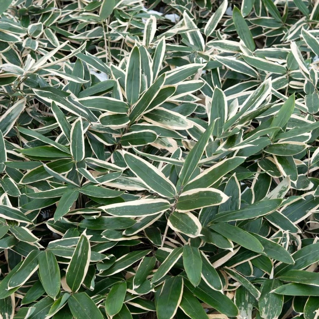 Le Sasa veitchii est un petit bambou japonais que l’on appelle parfois Sasa albo-marginata en raison de ses grandes feuilles qui se marginent de crème dès les premiers froids. Il s’agit d’un bambou à petit développement, doté d’un port buissonnant et dense, arborant un feuillage réellement splendide et dont l’abondance masque souvent les chaumes grêles. Peu traçant et d’une excellente rusticité, il se plait au soleil léger, comme à l’ombre dense, en tout sol frais sans excès de calcaire. Incontournable dans un jardin japonais, il excelle aux abords des points d’eau !