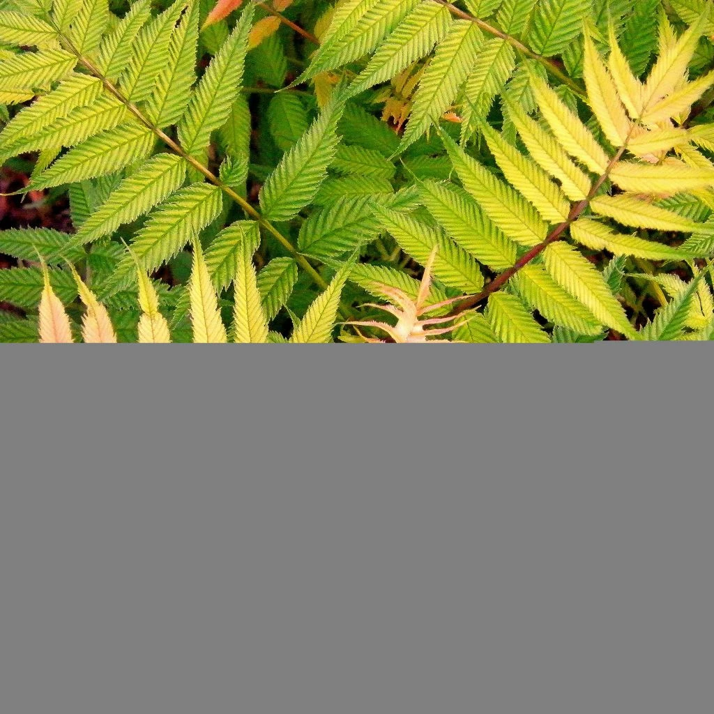 La Fausse spirée à feuilles de sorbier ‘Sem’ possède un port compact, érigé et touffu. L’atout majeur de cet arbuste est son feuillage, à double titre : par sa nature pennée, fortement découpée, les feuilles à folioles dentées mesurant 5 à 10 cm de long, mais aussi et sutout par la symphonie des couleurs dont il se pare. Les jeunes pousses naissent rose foncé, puis revêtent au fur et à mesure de leur croissance des teintes de beige rosé et bronze sur fond vert chartreuse, pour s’empourprer à nouveau à l’automne. La floraison apparait en juillet-août sous la forme d’opulentes panicules pyramidales de petites fleurs blanches dont l’aspect est léger et duveteux. Les rameaux brun vif à rouge restent décoratifs en hiver.